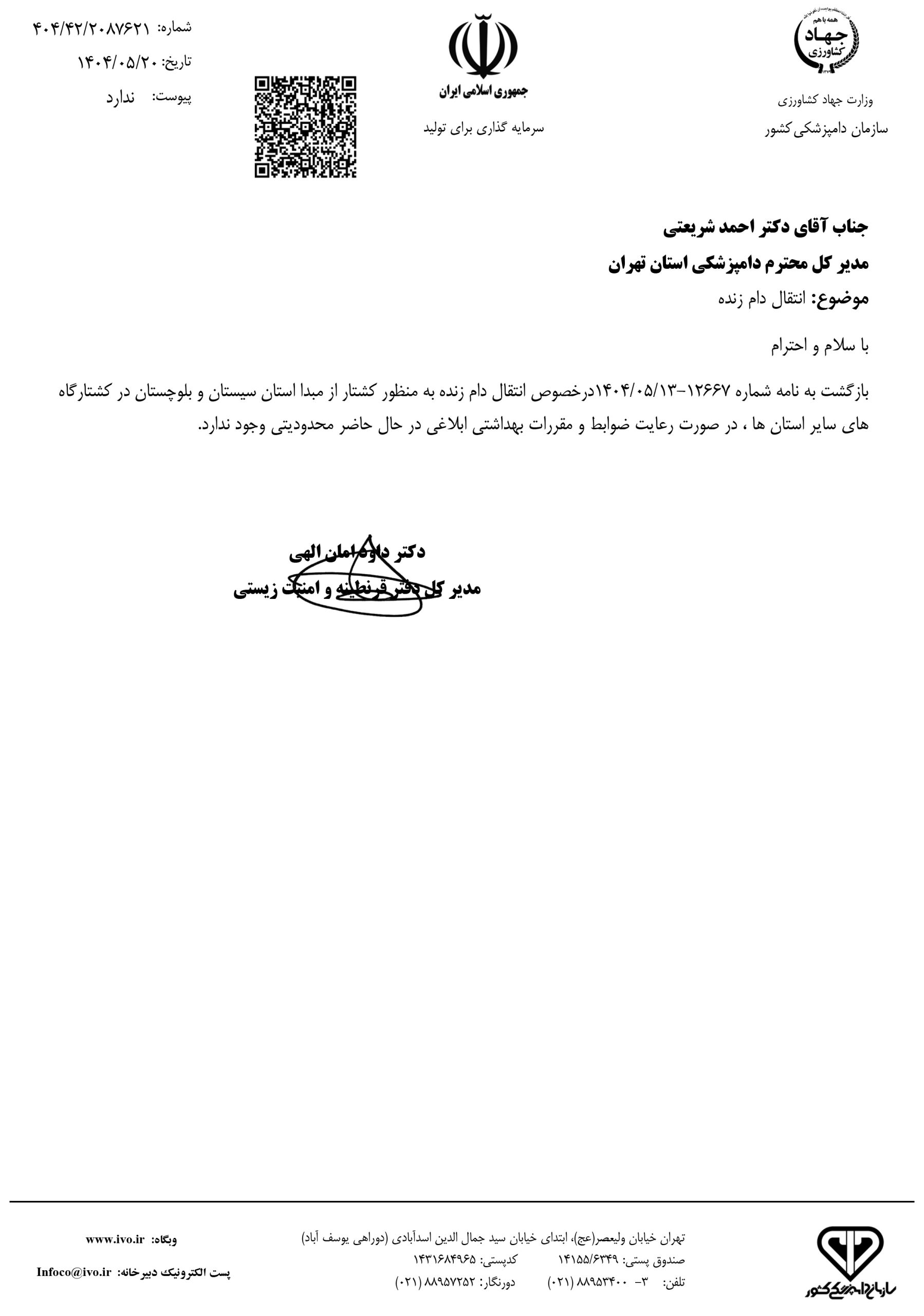 اما در کمال ناباوری «بهزاد منصوری» مدیرکل قرنطینه و بین الملل سازمان دامپزشکی کشور پس از ۱٫۵ سال خدمت برکنار می شود و ۱۰ اردیبهشت ۱۴۰۴ فردی به نام «دکتر داوود امان الهی» سکان سلامتی مردم ایران (در تامین پروتوئین و دام) را به دست می گیرد. و دستور می دهد انتقال دام زنده از سیستان و بلوچستان به تهران محدودیتی ندارد؟! یعنی دستوری که مدیر قبلی مبنی بر اینکه ((انتقال دام از استان سیستان و بلوچستان صرفا باید بومی و در فصل خاص و از کشتارگاه رسمی پس از آزمایشات مربوطه وارد اقصی نقاط کشور و تهران شود.)) را حذف و به قول معروف پاره می کند.