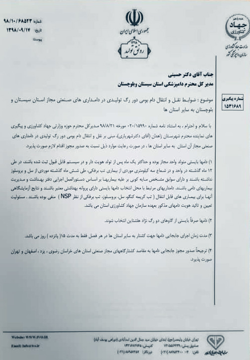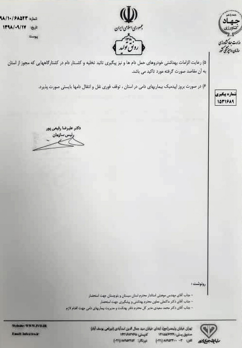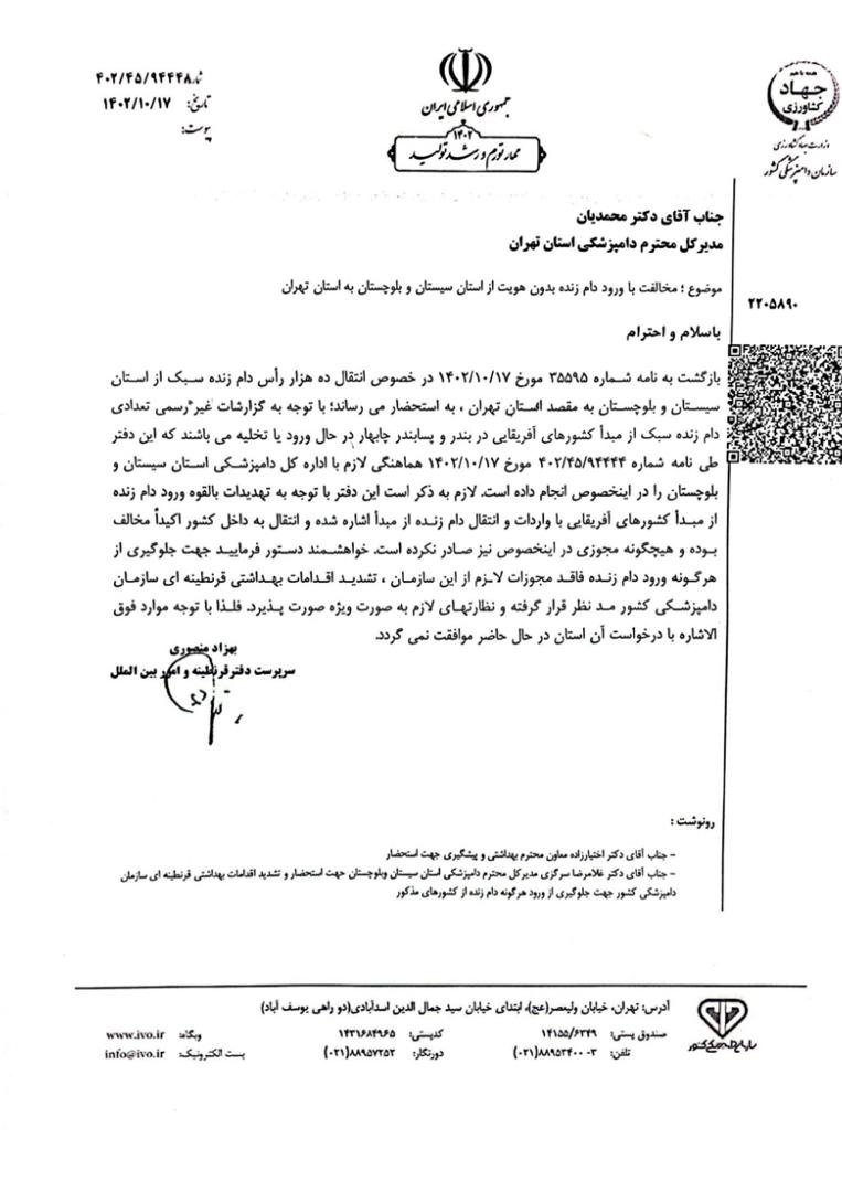 علی رغم این دستورالعمل بر اساس نامه شماره ۴۰۲/۴۵/۹۴۴۴۸ مورخ ۱۷ دی ماه ۱۴۰۲ بهزاد منصوری مدیر دفترقرنطینه و بین الملل سازمان دامپزشکی کشور متوجه می شود ۱۰ هزار راس گوسفند زنده از استان سیستان و بلوچستان به سمت تهران راهی هستند. و گزارش ها می گوید که در همین زمان تعدادی دام آفریقایی هم در بندرچابهار تخلیه شده است. در نامه دکترمنصوری به مدیرکل دامپزشکی استان تهران عنوان شدهمانع ورود این دام به تهران شود.