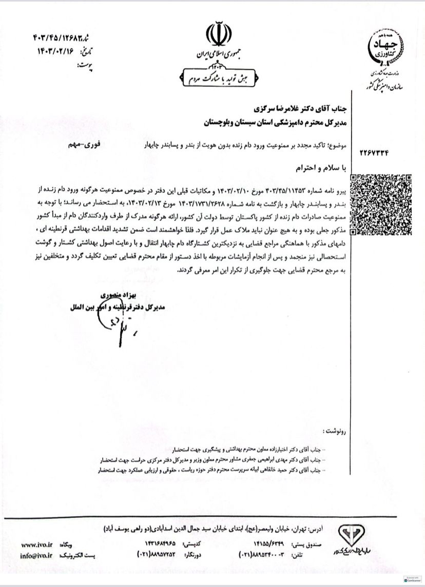 اما این ماجرا ادامه دار می شود و دوباره دام مشکوک این بار از طریق پاکستان راهی ایران می شود. لذا بهزاد منصوری رئیس اداره قرنطینه و بین الملل سازمان دامپزشکی کشور طی نامه مهم و فوری در تاریخ ۱۶ اردیبهشت ۱۴۰۳ خطاب به غلامرضا سرگزی مدیرکل دامپزشکی سیستان و بلوچستان می نویسد که ورود دام زنده از پاکستان ممنوع است و مدارک دولت پاکستان هم فاقد اعتبار است. لذا به سرعت همه دام ها سلاخی و وارد سردخانه شوند تا قاضی تصمیم بگیرد.